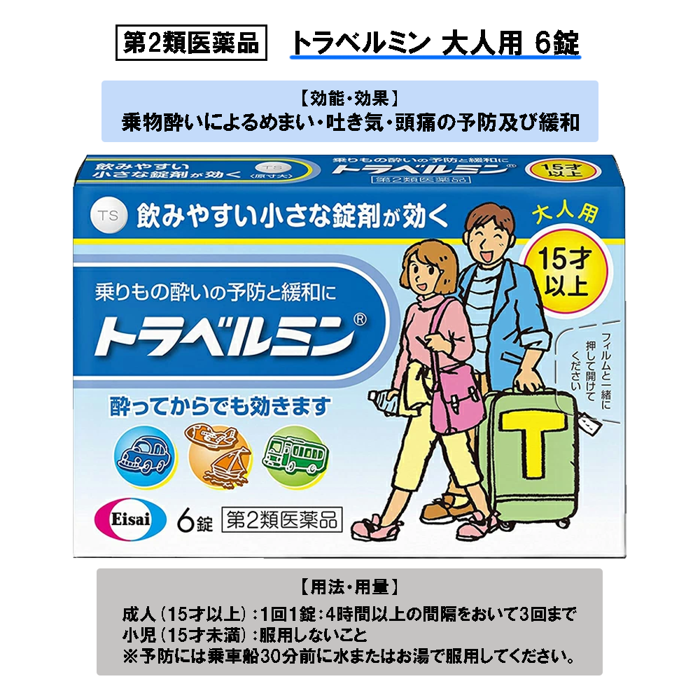 商品説明 | トラベルミンは、乗りもの酔い症状の予防及び緩和に有効な、大人用の乗りもの酔い薬です。酔う心配がある場合、乗る30分前の服用により、乗りもの酔い症状が予防できます。また、酔ってしまった時でも、服用によって乗りもの酔い症状である「めまい」「吐き気」「頭痛」を改善し、旅行を楽しむことができます。 |