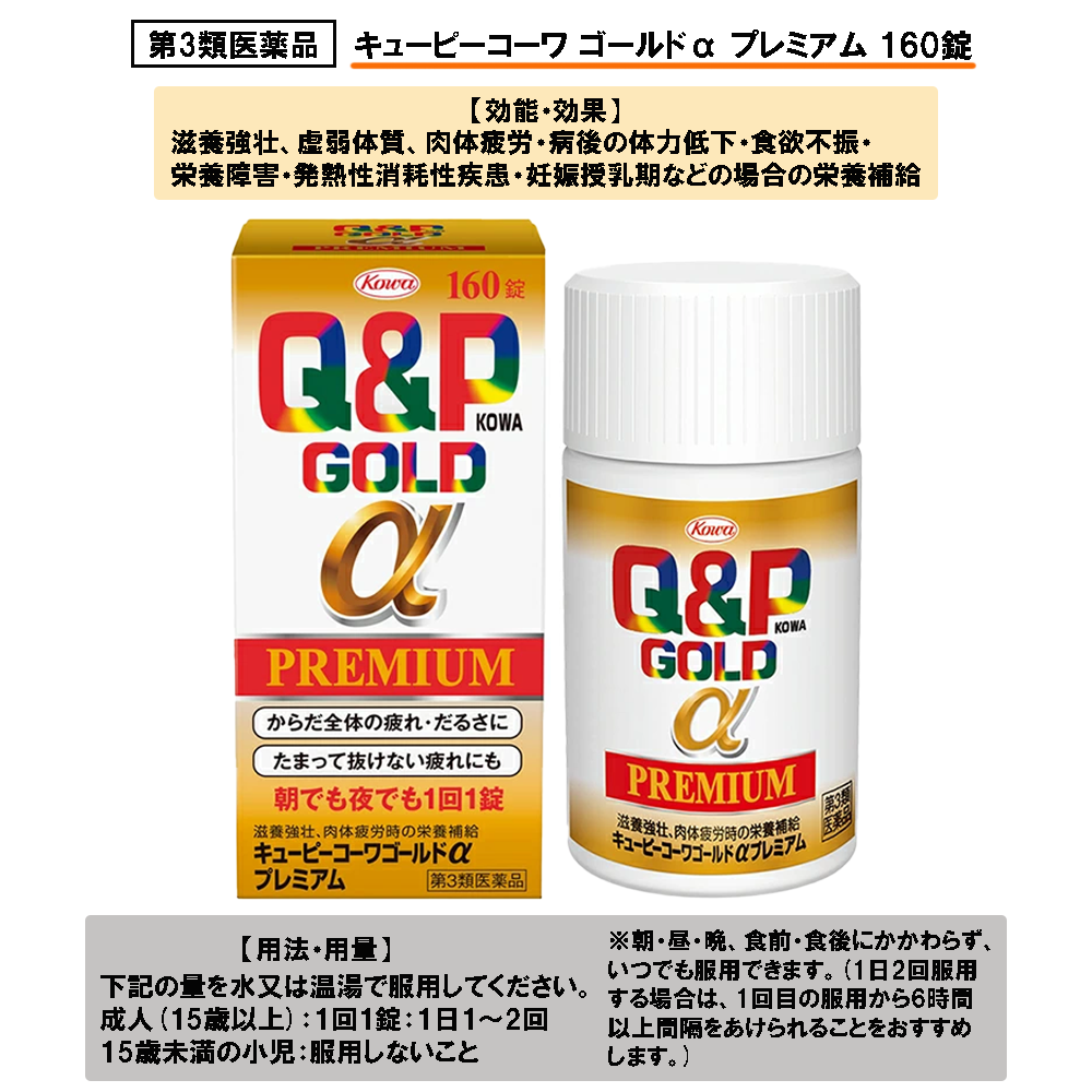 商品説明 | ●ビタミン含有保健薬 ●滋養強壮、肉体疲労時の栄養補給 ●生活環境が目まぐるしく変化する現代社会。仕事・家事・育児などのストレスや睡眠不足などによって、「からだ全体が疲れた」、「だるくてしんどい」といった症状が日常的に起こっています。一時的な疲れでも、十分な休養が取れずにムリを続けていくと、疲れが蓄積し、一晩休んだぐらいでは疲れがなかなか抜けないようになってしまいます。 ●「最近ムリが続いているな」、「疲れが残って朝起きるのがつらい」。そんな時にはキューピーコーワゴールドαプレミアムが効果的です。本剤にはトチュウ・シャクヤクをはじめとした5種の滋養強壮生薬に加え、L-アルギニン塩酸塩と5種のビタミンが同時配合されており、疲れにすぐれた効果を発揮します。1回わずか1錠。朝でも夜でも1日1回からの服用で、よく効くように出来ています。 |