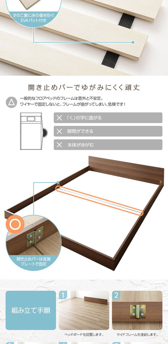 ・床板の上に直接乗ったり、薄手のマットレスや布団で使用すると、床板が破損する恐れがあります。