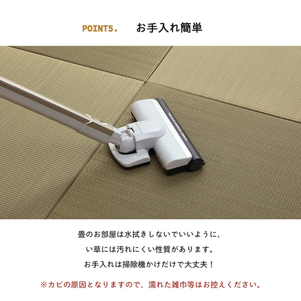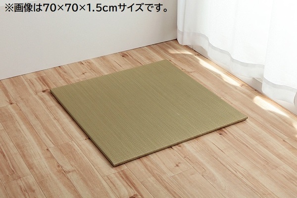 フローリングに置くだけ。なつかしい畳の香りと肌ざわりを手軽に楽しめます。い草には空気の自然浄化作用、湿度の調節作用などがあります。また汚れにくく、使用するうちに黄金色に変化し味が出ます。中材は木製ボードタイプ+ポリエチレンで程よいクッション性と重量感があります。