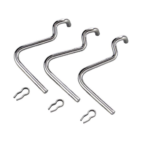 縦横使いができる展示パネルの専用パーツ、有孔ボード用フック(3個入)。有孔ボードパネル面の孔部分に引っ掛けて使うフックです。紐で吊るタイプの掲示物などに便利です。ご使用に合わせて追加してお使いください。