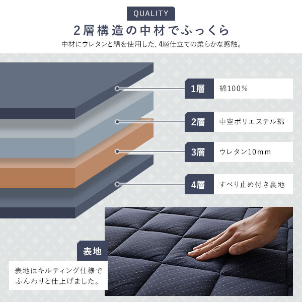 中材:(上層)中空ポリエステル綿100%、(下層)ウレタンフォーム10mm