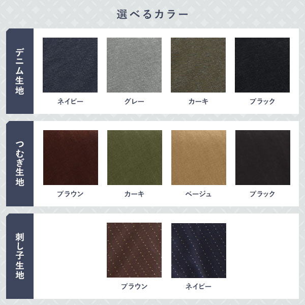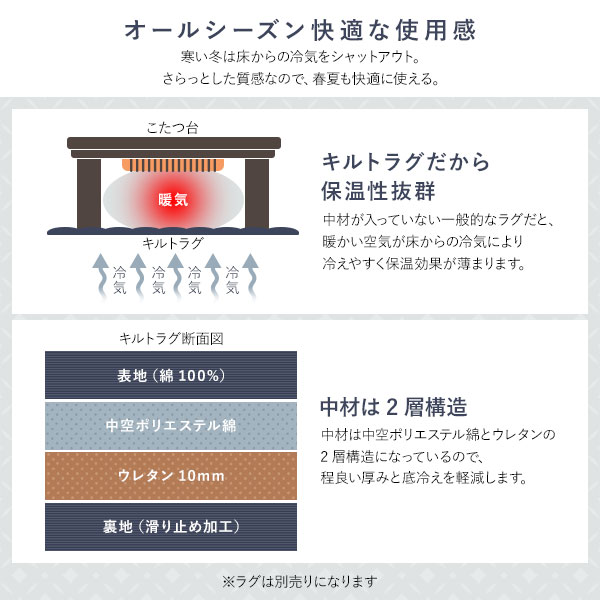 ・こたつ掛け布団単品は現在、直径205cm(円形)・つむぎ柄カーキと、185×225cm(楕円形)・刺し子柄ネイビーのみの販売となります。その他については完売いたしました。