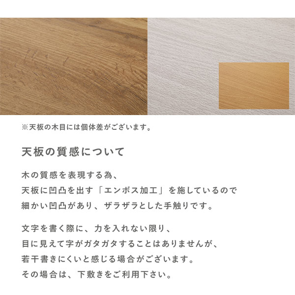 木の質感を表現する為、天板に凹凸を出す「エンボス加工」を施しているので細かい凹凸があり、ザラザラとした手触りです。