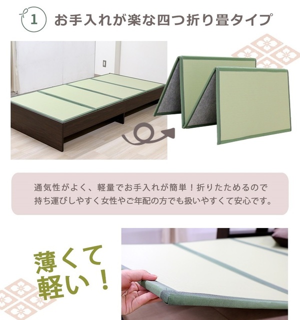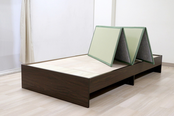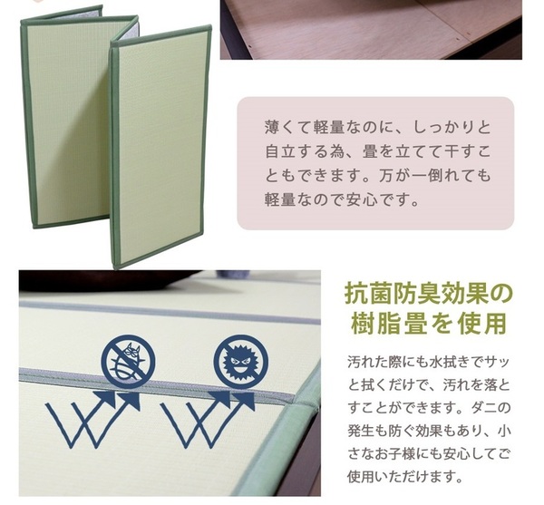 清潔感を長持ちさせる樹脂畳を使用した畳ベッド。更に、樹脂畳は厚さ約1.5cmの超軽量タイプとなっており、畳の取り外しもとても簡単です。