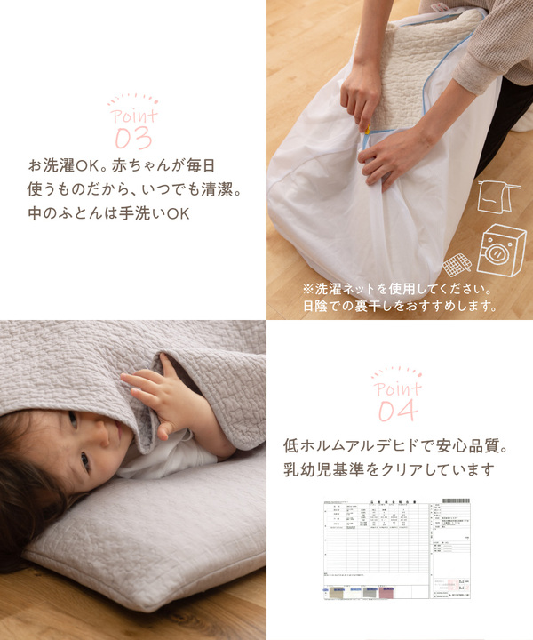 くもの形のキルト加工で、ぽこぽこ感がかわいい綿100%のベビーマット。さらっとした肌触りで快適。中の布団は6cmの固綿入りでへたりにくい仕様。