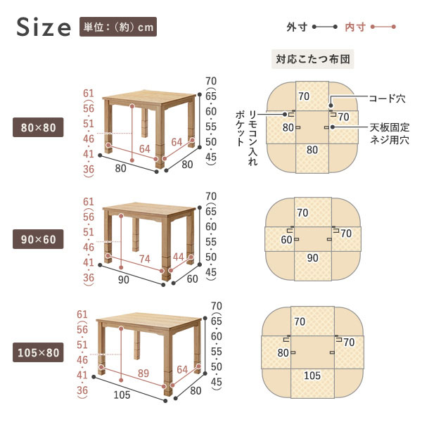 80×80cm:幅80×奥行80×高さ45/50/55/60/65/70cm・21kg