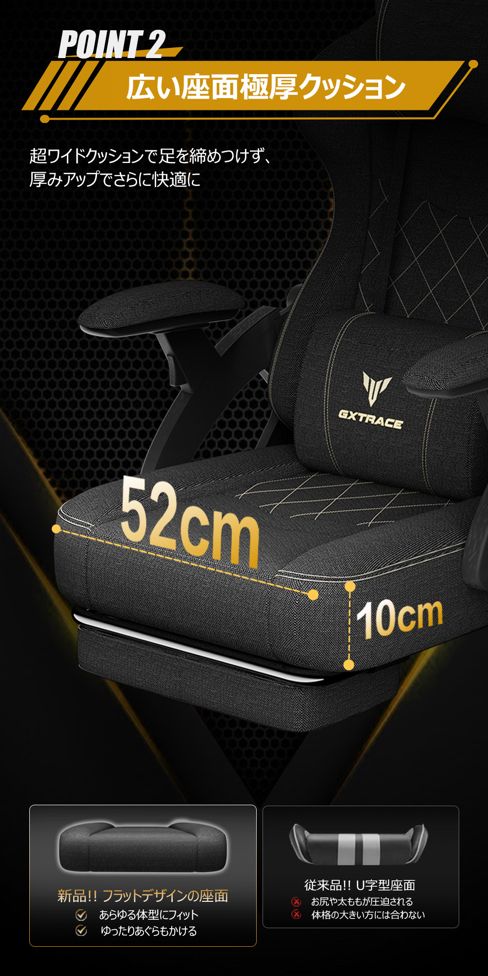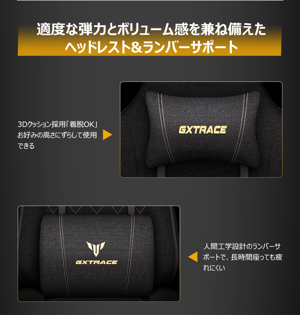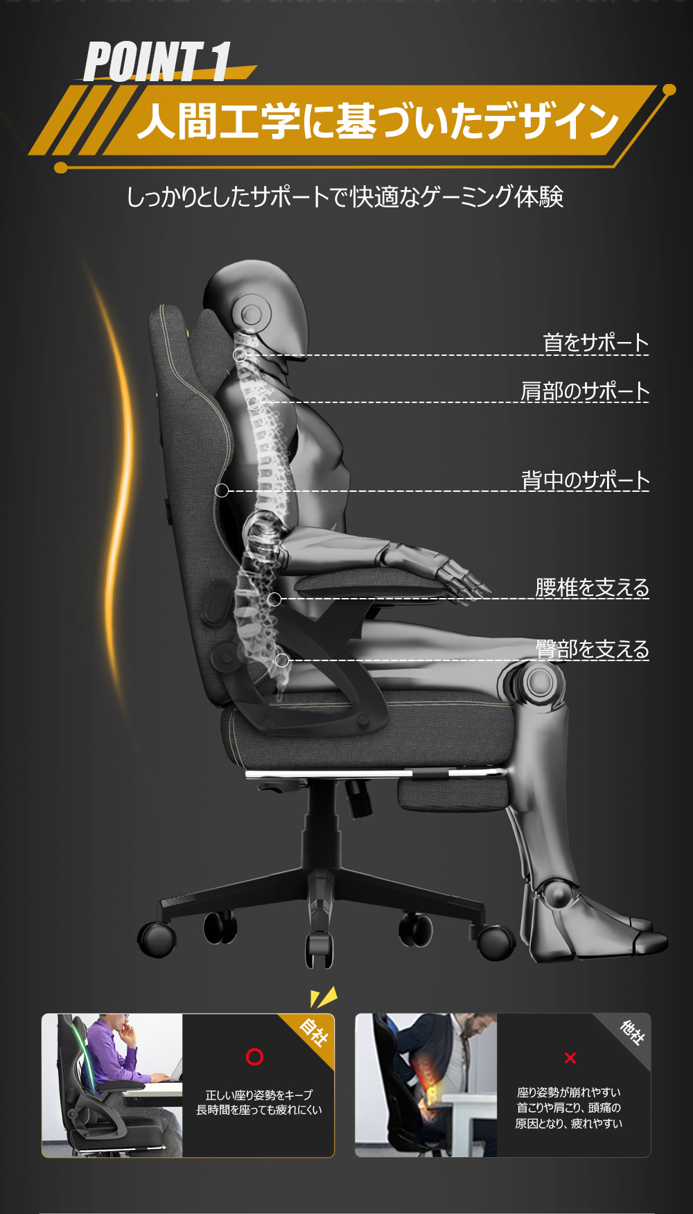 【長時間座っても疲れにくい】ゲーミングチェアは高反発ウレタンを採用しており、ヘタリにくい。バイオニック曲線の背もたれと腰クッション が腰椎をサーポートする、腰部の負担を軽減、長時間座っても疲れにくいです。