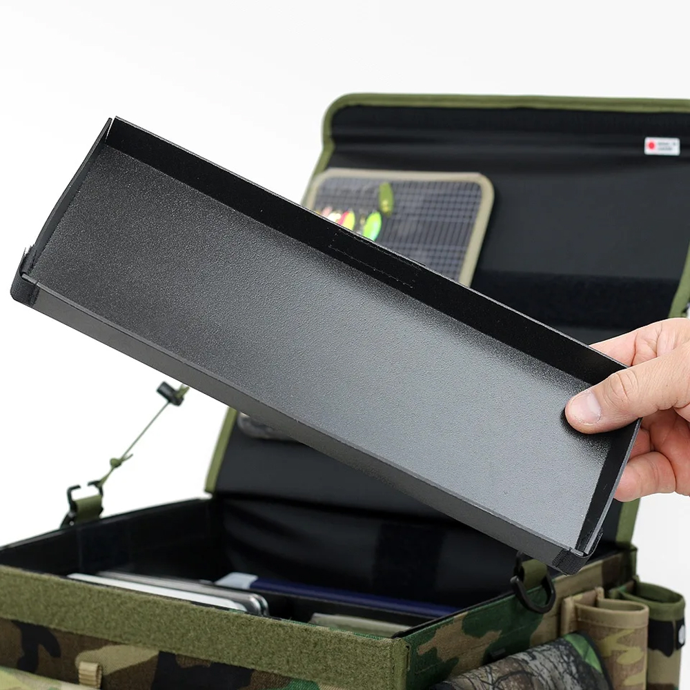 付属の仕切り板を支えに利用した画期的な片側跳ね上げ式の内装用トレイです。本体との接続部は面ファスナーの1点止めになっており取り外しも簡単です。