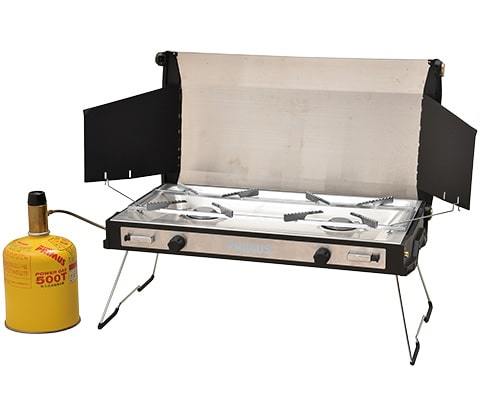 トゥピケは、折りたたみ式スタンドと風防を備えたコンパクト設計のツーバーナーです。