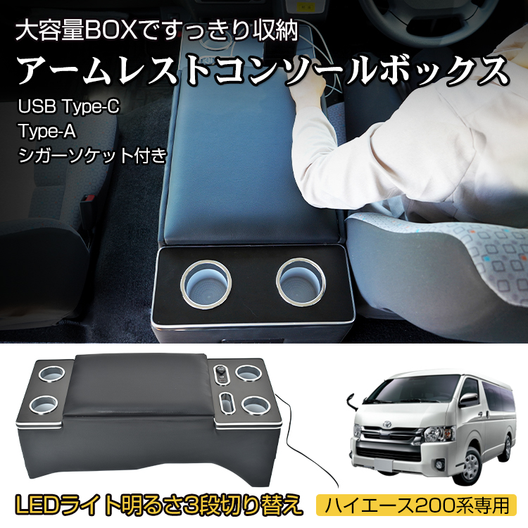 ハイエース センターコンソール コンソールボックス ハイエース200系 1〜7型 アームレスト ドリンクホルダー 肘掛け 収納 LED USB 内装 トヨタ HIACE TOYOTA 200