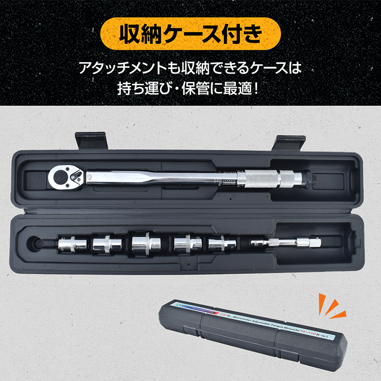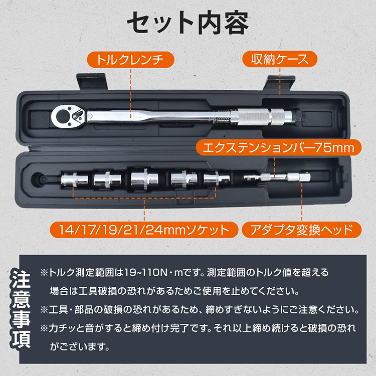 トルクレンチセット トルクレンチ プレセット型 3/8インチ 19-110N・m バイク 整備 工具 エンジン整備 ソケット5種 14mm 17mm 19mm 21mm 24mm 収納ケース Nm K