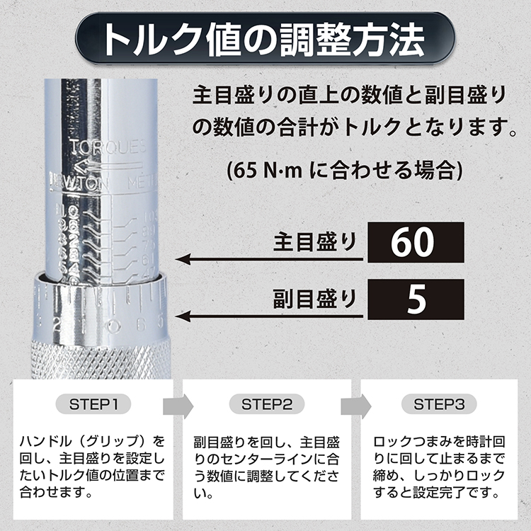 ■ N・m/KGSの2スケール表示と5N・m刻みで細かな設定が可能です。