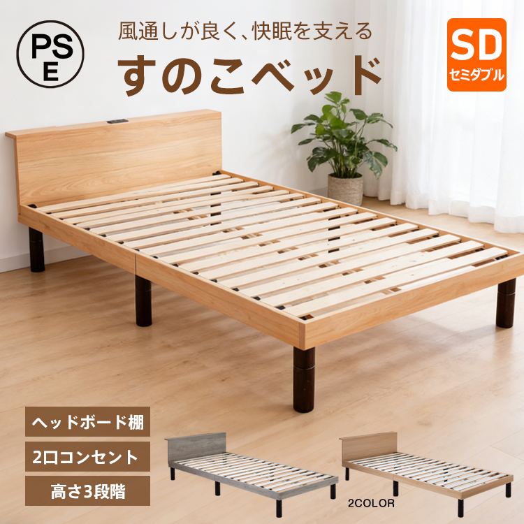 ベッド セミダブル すのこベッド 宮棚付き ベッドフレーム 木製 ローベッド 耐荷重200kg 高さ調節可能 2口コンセント付き 収納 頑丈 おしゃれ セミダブルベッド
