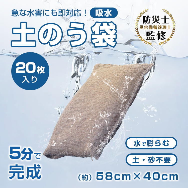 土のう 袋 土嚢袋 20枚入り 吸水 土不要 砂不要 水で膨らむ 膨張 台風 豪雨 洪水 水害 大雨 浸水 対策 防災 常備 災害 対策 屋外 備え 防災セット 防災グッズ