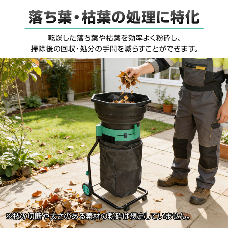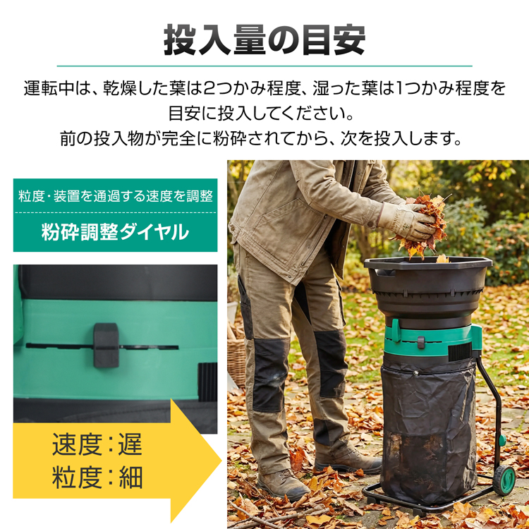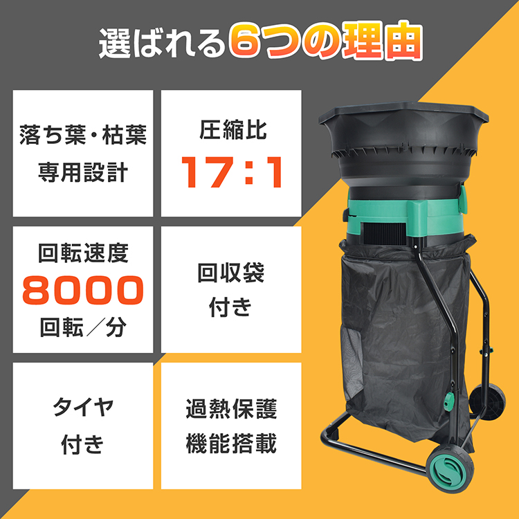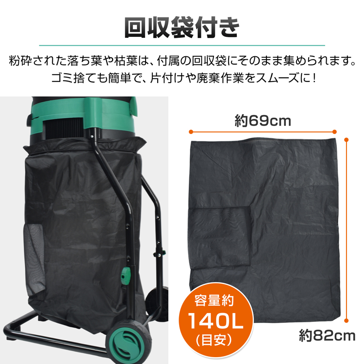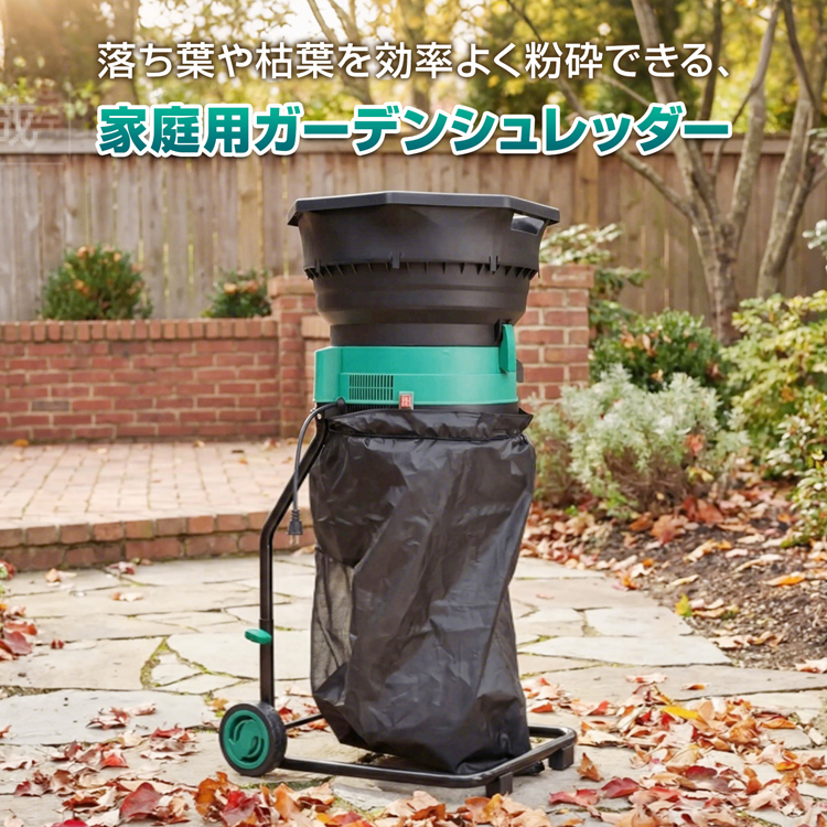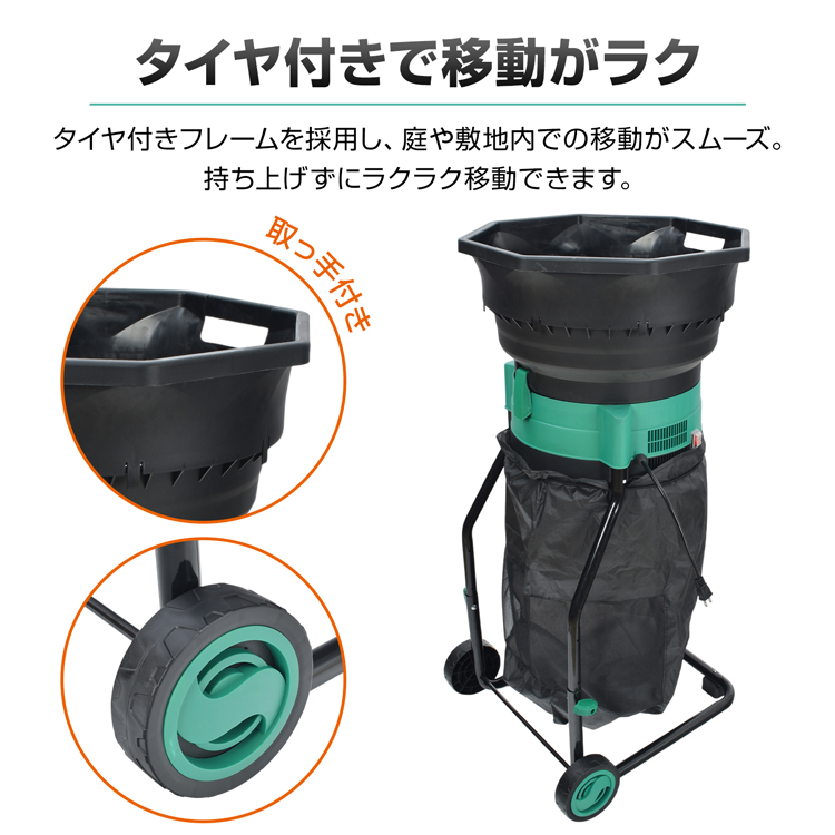 電動粉砕機 ガーデンシュレッダー 家庭用 粉砕 枯葉処理 庭掃除 カッティングライン式 回収袋付き タイヤ付き 過熱保護 学校 校庭 清掃 園芸 落ち葉処理 庭 清掃