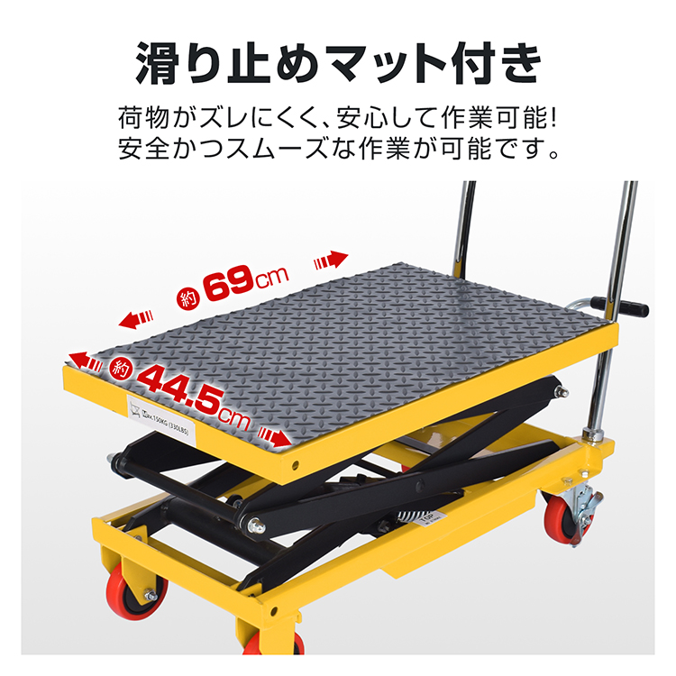 台車 昇降台車 油圧式 150kg リフトテーブル 滑り止め ゴムシート 手押し台車 キャスター ハンドリフター リフト台車 リフトアップ ストッパー 荷物運搬 作業台