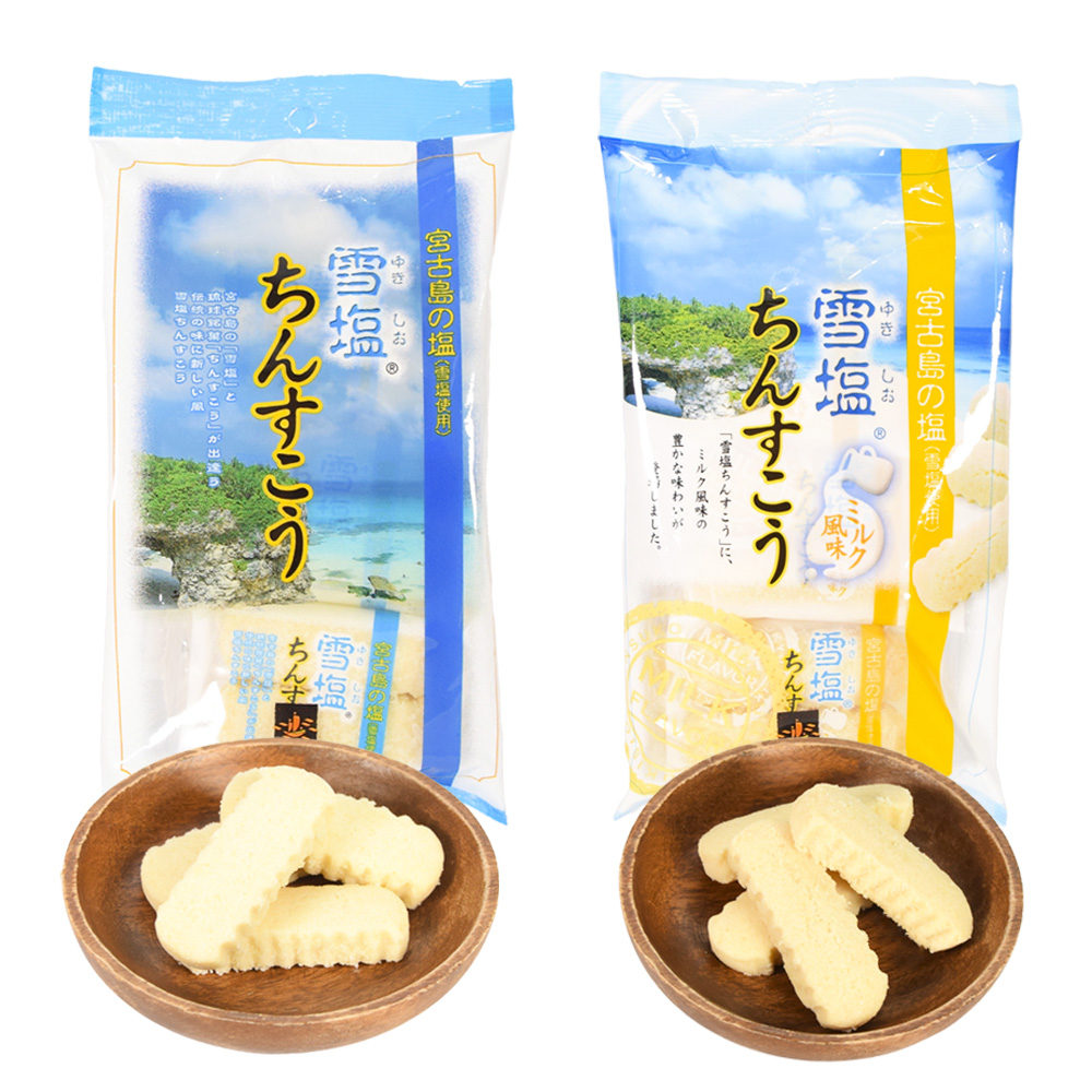 | 商品説明 | 宮古島の塩「雪塩」とちんすこうの出会い・・・ 宮古島の地下海水を汲み上げて精製された「雪塩」と琉球の伝統菓子「ちんすこう」を独自の製法で組み合わせ、 ほんのり甘くさっぱりとした味わいになりました。 ミルクの優しい甘さと雪塩の塩加減がマッチした豊かな味わいの「雪塩ちんすこうミルク風味」もオススメです。 おやつに、おみやげに大好評です。 ●砂糖の結晶がまれに褐色を帯びることがありますが品質には問題ありません。 ●開封後、お早めにお召し上がりください。 |