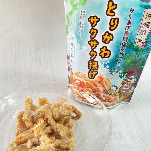 | 原材料 | >>沖縄の塩味<< 鶏皮(国産)、米油、デンプン、上用粉、鶏ガラスープ、塩、酵母エキス、ホワイトペーパー >>シークヮーサー味<< 鶏皮(国産)、米油、デンプン、上用粉、シークヮーサー果汁パウダー(デキストリン、シークヮーサー果汁)、鶏ガラスープ、塩、酵母エキス、ホワイトペーパー |