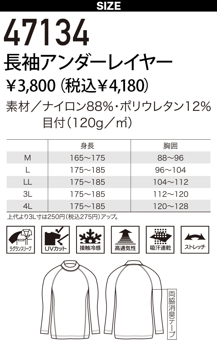 クロダルマ コンプレッション 47134 長袖アンダーレイヤー ストレッチ ファン付き作業服インナー 吸汗速乾 徹底消臭