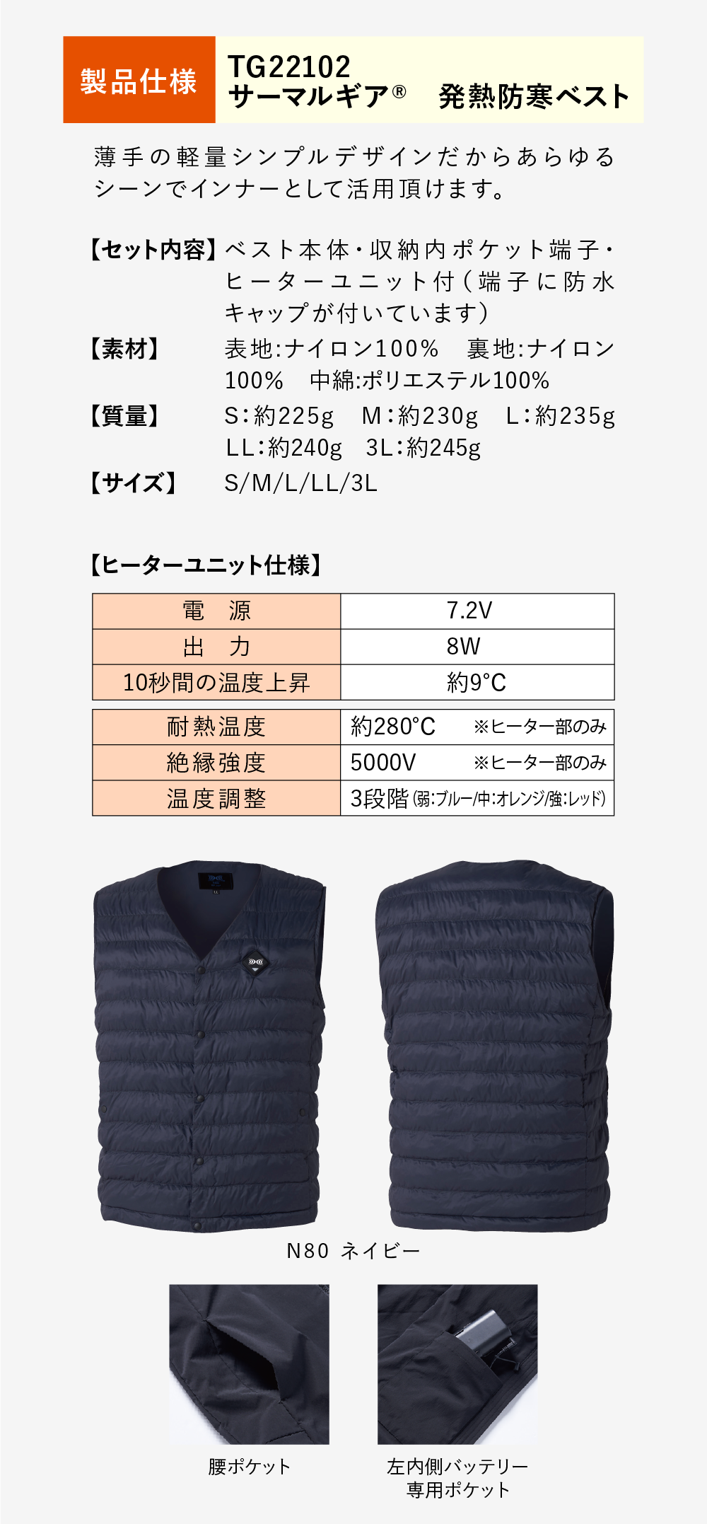 | 製品名 | TG22101 サーマルギア(R) 発熱防寒ベスト |
