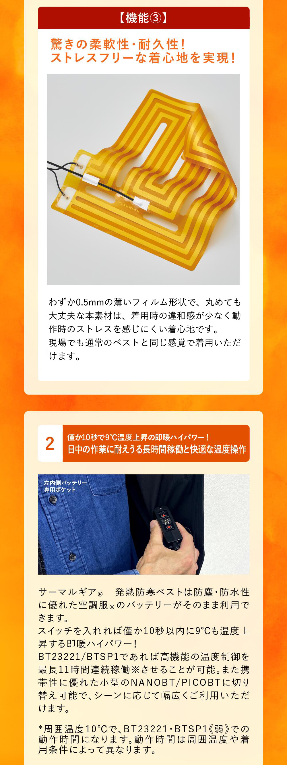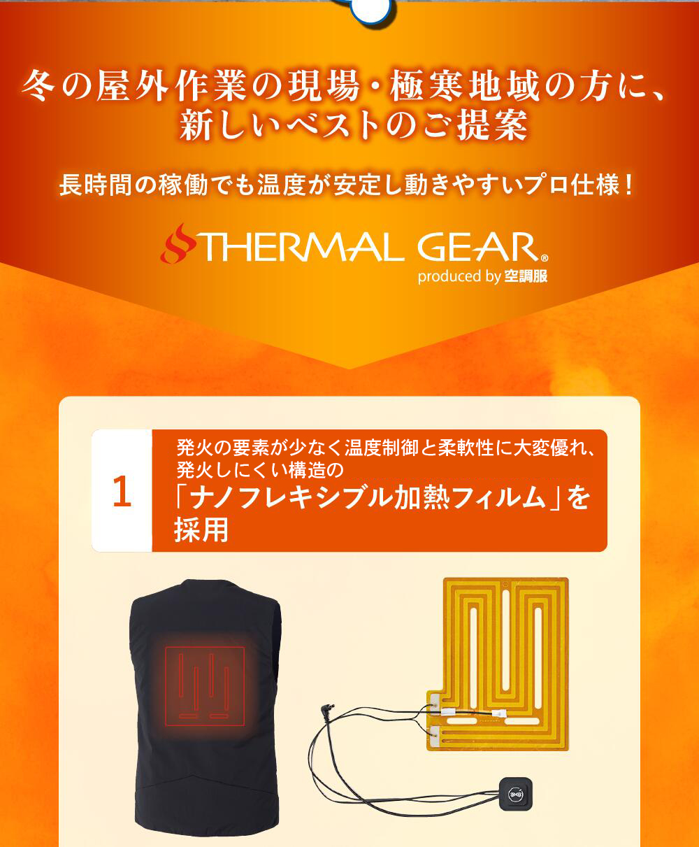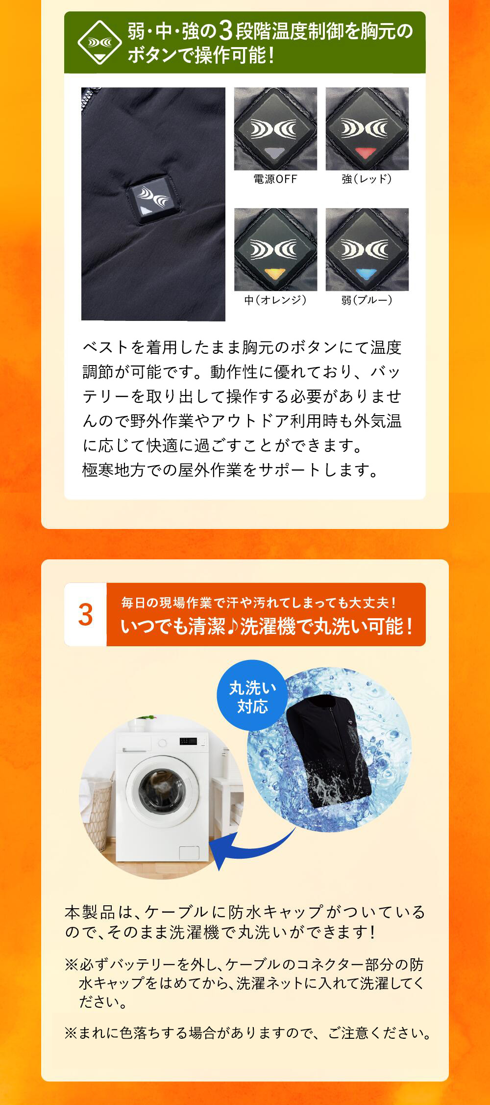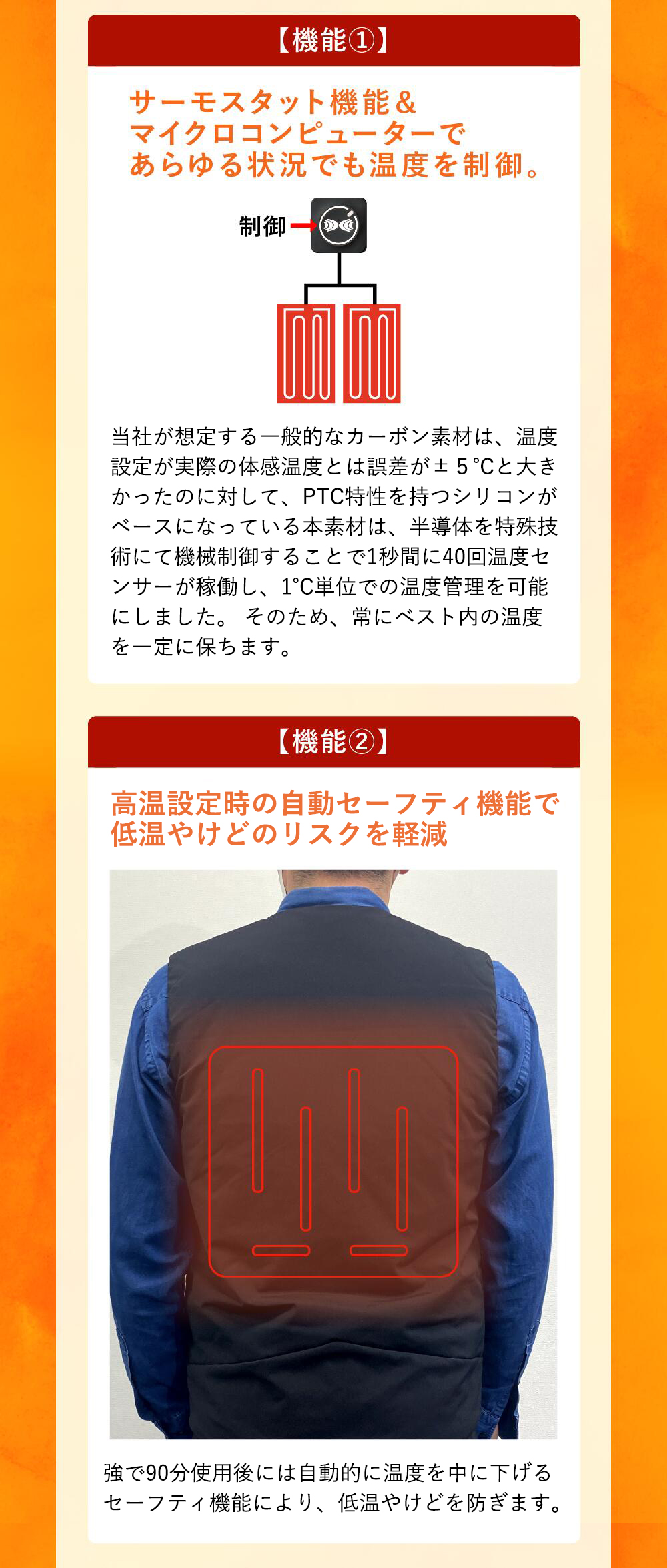 | 製品説明 | 空調服(R)ユーザー待望の発熱防寒ベスト スイッチを入れると約10秒でぽかぽかあたたまり、冬の屋外作業からアウトドア・レジャーなどで大活躍。夏も冬も同じ空調服(R)用バッテリーがご使用いただけます。 低温やけど対策の高機能 温度設定を「強」にして使用していた場合、90分後に自動的に「中」に切り替わり低温やけどを防ぎます。 |
