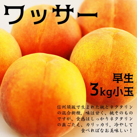 桃とネクタリンの自然交配で生まれたのがこのワッサーです。品種登録されたのが平成2年という、まだまだ新しい品種であり、知る人ぞ知る果物なのです。 果実がしっかりとして固めの歯ごたえで、食べるときに果汁で手が汚れず食べやすく、 果肉には、カロチンや鉄分が多く健康に良い果物です。