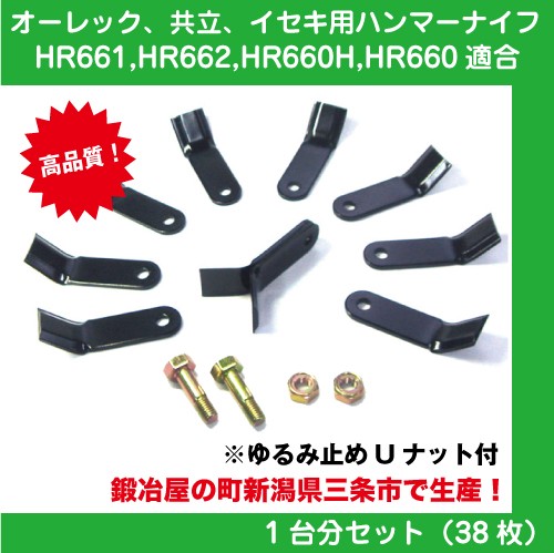 【鍛冶屋の町新潟県三条市生産】草刈り機オーレック・共立・イセキ HR661 HR662 HR663 HR660H用ハンマーナイフモア替刃 38枚&取付ボルト19組セット ■商品内容 ●鍛冶屋の町新潟県三条市生産のこだわりのハンマーナイフモア用替刃 品質重視・高品質・高耐久性の替刃です。 ● 草刈のプロ 農家さん、業者様向けにオススメです! ハンマーナイフモアー用替刃は作業する場所によって摩耗度が異なります。替刃は消耗品ではありますが当店では皆様に安心してご使用して頂ける高品質の替刃を常時大量在庫しております。 ※本機の型式が不明な場合ご使用の刃のサイズを計った上、下記スペック表をご確認下さい。 |