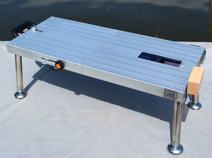 シンプルな小型のアルミ釣り台で、上部面にはプラ製の小物入れがり、後ろにはパラソルを固定できるステーもついています。