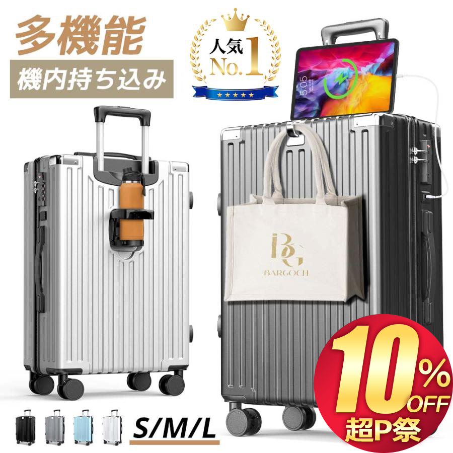 スーツケース 機内持ち込み 大容量 静音 軽量 カップホルダー USB充電ポートファスナー Sサイズ シルバー