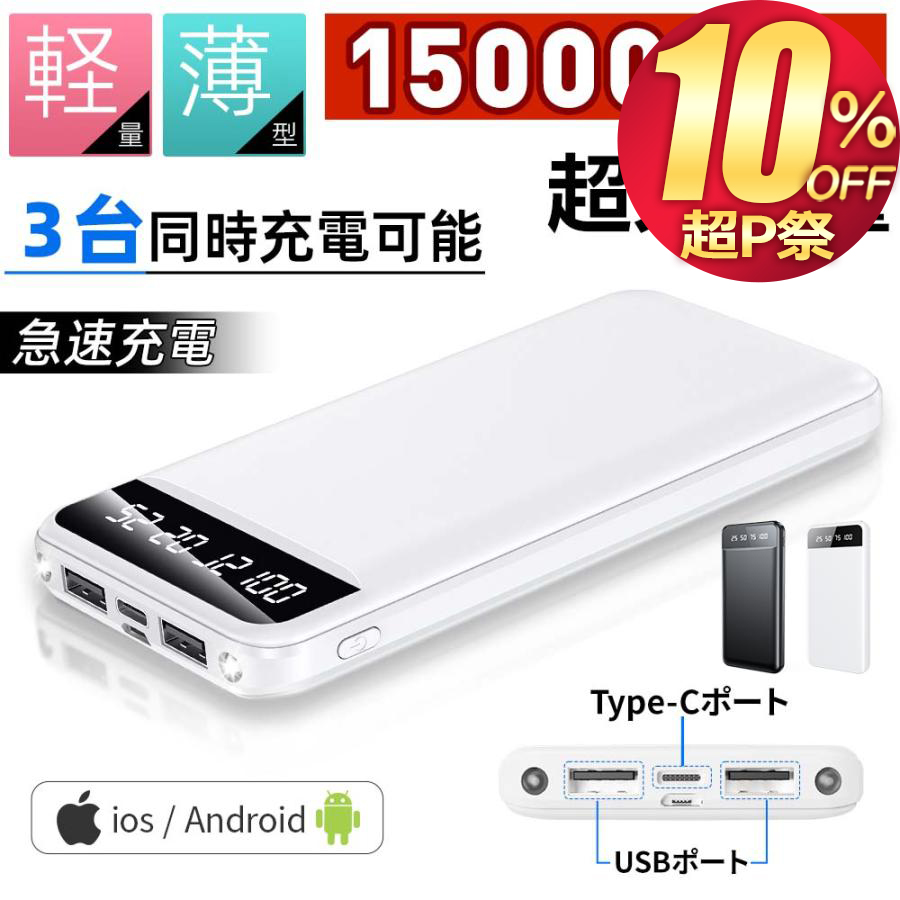 モバイルバッテリー 大容量 15000mAh 大容量 小型 軽量 薄型 3台同時充電 急速充電 残量表示 ライト付き スマホ充電器 携帯充電器 スマホ充電器 iphone 充電器 持ち運び充電器 軽量 モバイル Ipad充電器 air iPhone スマートフォン iphone充電器 アウトドア アンドロイド android イヤホン 急速充電器 台風対策 防災グッズ 敬老の日 アイホン iphone7 iphone8 iphone11 iphone12 iphone13 iphone14 iphone15 iphone16 iphone17 ipadなど対応 スマホバッテリー 爆買