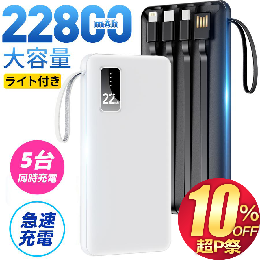 【2台目1199円でGET!】 モバイルバッテリー 大容量 小型 軽量 22800mAh 薄型 5台同時充電 急速充電 5v/2.4a スマホ充電器 残量表示 Lightning 4本ケーブル内蔵