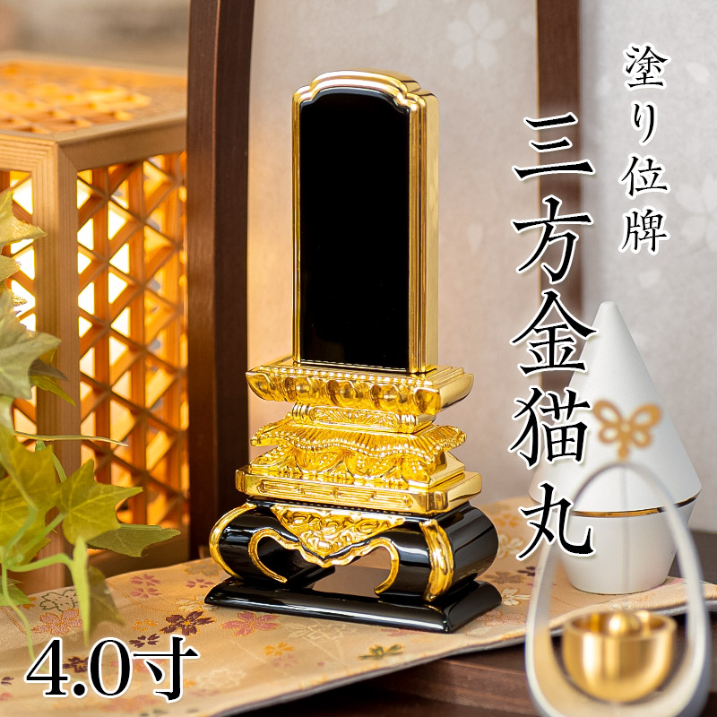 位牌 塗り位牌 三方金猫丸 4寸 4.0寸 高さ:20.2 お位牌 仏壇 仏具 4.0寸