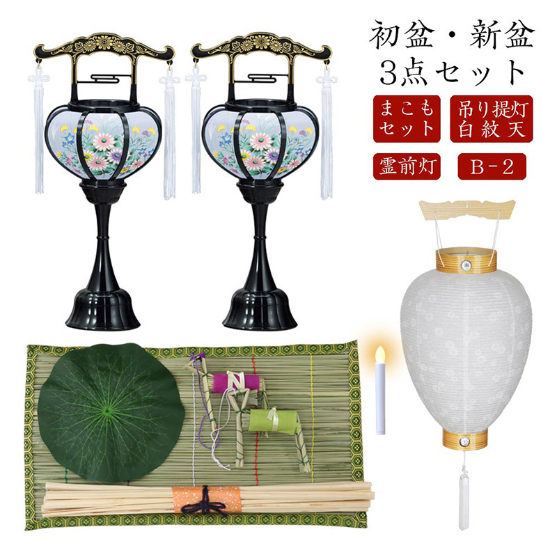 初盆セット 新盆セット 白紋天+霊前灯+まこもセット【初盆・新盆 初盆 3点セット B-2】お盆飾り 初盆飾り 盆提灯 盆ちょうちん 提灯