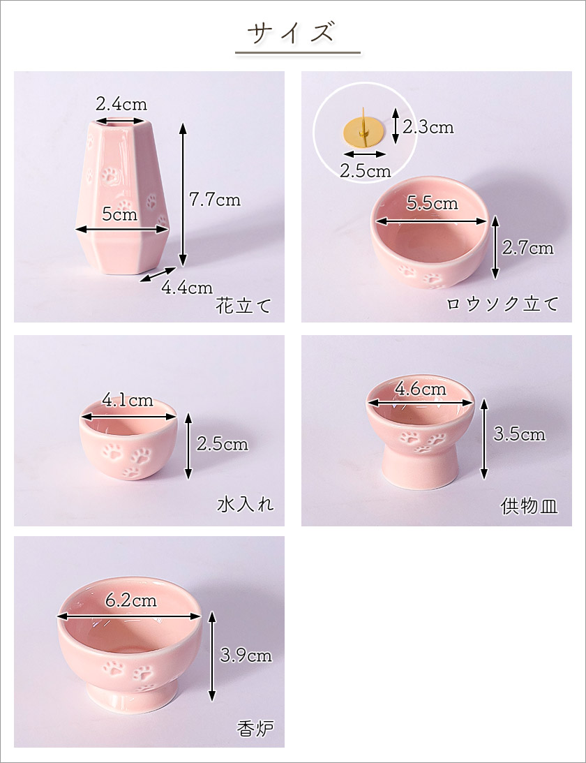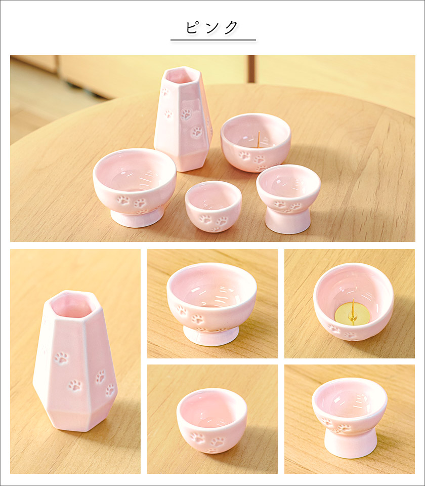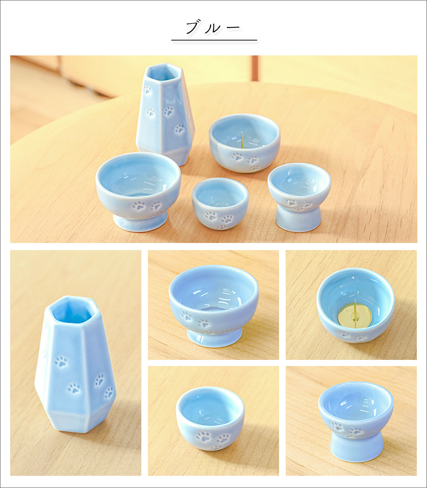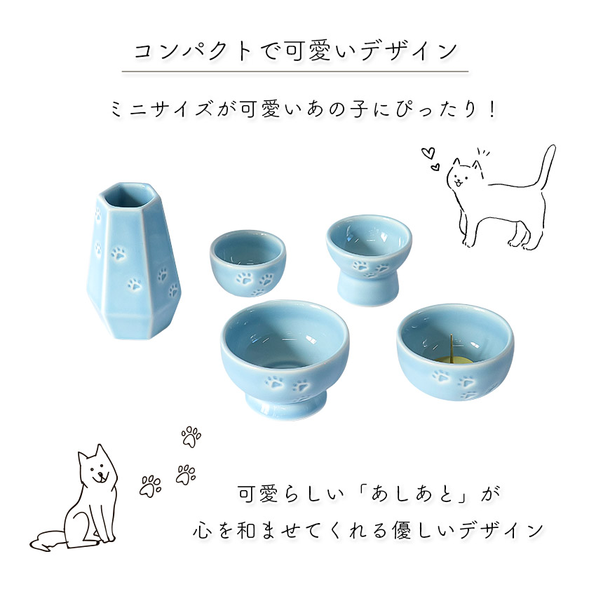 やさしい色合いと可愛らしい「あしあと」が心を和ませてくれる陶磁器の仏具5点セットです。