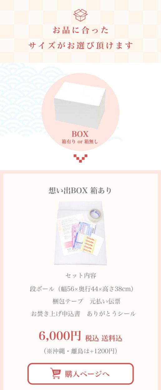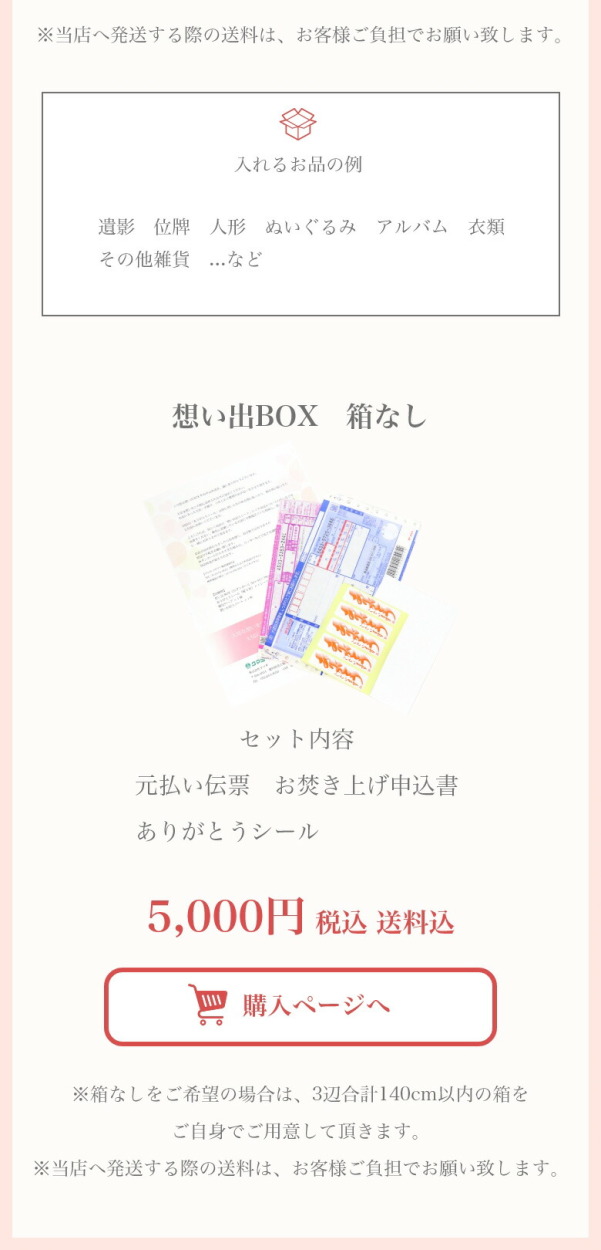 1. 想い出梱包セットを買い物かごに入れ、配送先等を記入の上、ご購入頂きます。