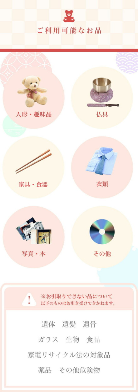 ・遺体、遺髪、遺骨 ・ガラス ・生物、食品 ・家電リサイクル法の対象品 ・危険物