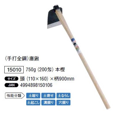 (手打全鋼)唐鍬 750g(200匁)本樫 頭(110×160)×柄900mm 土堀り 土寄せ 土ならし 土起こし 溝掘り 穴掘り 15010 浅野木工所