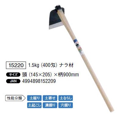 (手打全鋼)唐鍬 1.5kg(400匁)ナラ材 頭(145×205)×柄900mm 土堀り 土寄せ 土ならし 土起こし 溝掘り 穴掘り 15220 浅野木工所