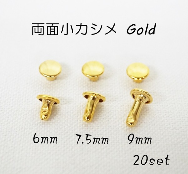 両面小カシメ (頭6mm) ゴールド 本金メッキ(やや薄い色目です) 20個セット 足6,7.5, 9 mm kume384