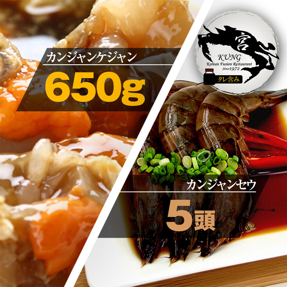 【西麻布韓国料理宮(KUNG)】カンジャンケジャン(北海道産ワタリガニの醤油漬け) 650gタレ含み + 車エビ醤油漬け 5頭 - お得なセット商品!