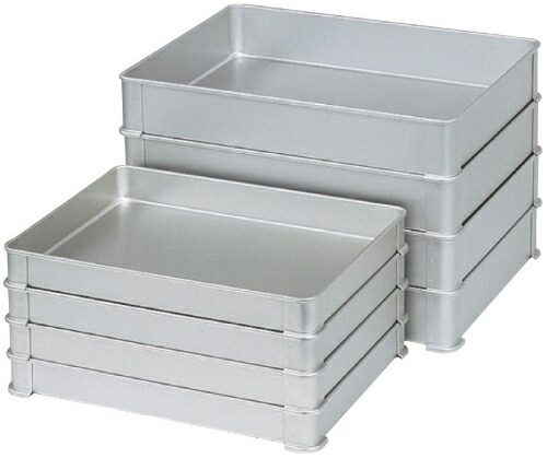 商品名:/即納/ アルミ バット システムバット 40 特大 日本製 アカオ / 餃子バット 硬質アルミ カギ型 番重トレー フードコンテナ 揚げ物 フタ 蓋 アカオアルミ 業務用メーカー:アカオアルミ(AKAO)サイズ :外寸法 472mm×362mm×40mm板厚  :1.1mm容量  :6.5L材質  :硬質アルミ・普通アルミより2倍以上強いフラット底面は変形に強くお手入れも簡単で衛生的です。底に補強のためのヒモ出し加工がないため餃子など柔らかい素材に跡がつきません。・運搬に便利な積み重ね精度の高いカギ状のスタッキングでガッチリ積み上げられます。・スピーディーな冷凍、冷蔵、解凍アルミの熱伝導率は、スチールの3倍、ステンレスの13倍、プラスチックの448倍と他素材に比べて大変優れているので、スピード冷凍・解凍ができます。