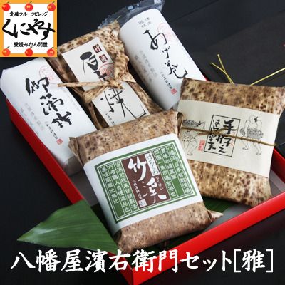 ◆八幡屋濱右衛門セット[雅]・ 真空・厚焼:竹遊1本、手付百練:御蒲鉾1本、手巻百練:あげ巻 1本、竹ちくわ:竹渓(3本入)1包、竹包み特上じゃこ天(5枚入)1包◆お届け方法:宅配便/クール便ヤマト運輸配送※北海道本島は佐川急便※宅配ボックス利用不可 ※北海道本島+462円,北海道離島+1,177円,沖縄+1,067円)
