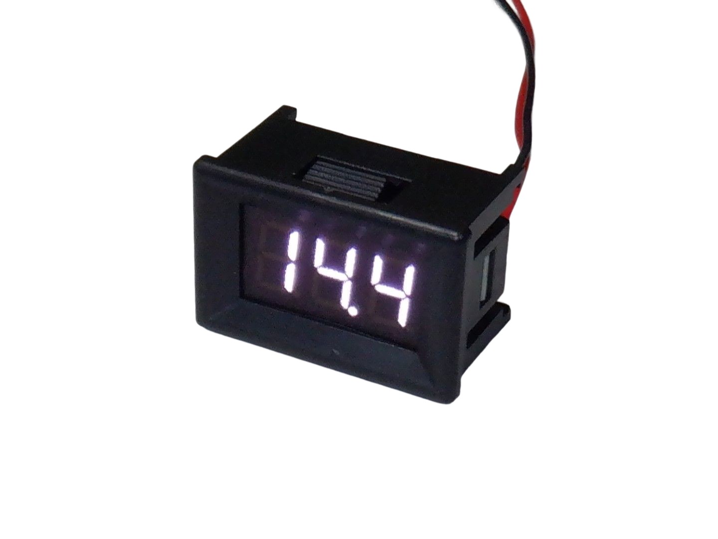 測定範囲はDC4V-DC30V。リード線の長さは19センチ。表示は 白色になります。 表示部サイズ35mm(W)×23mm(H)×20mm(D)