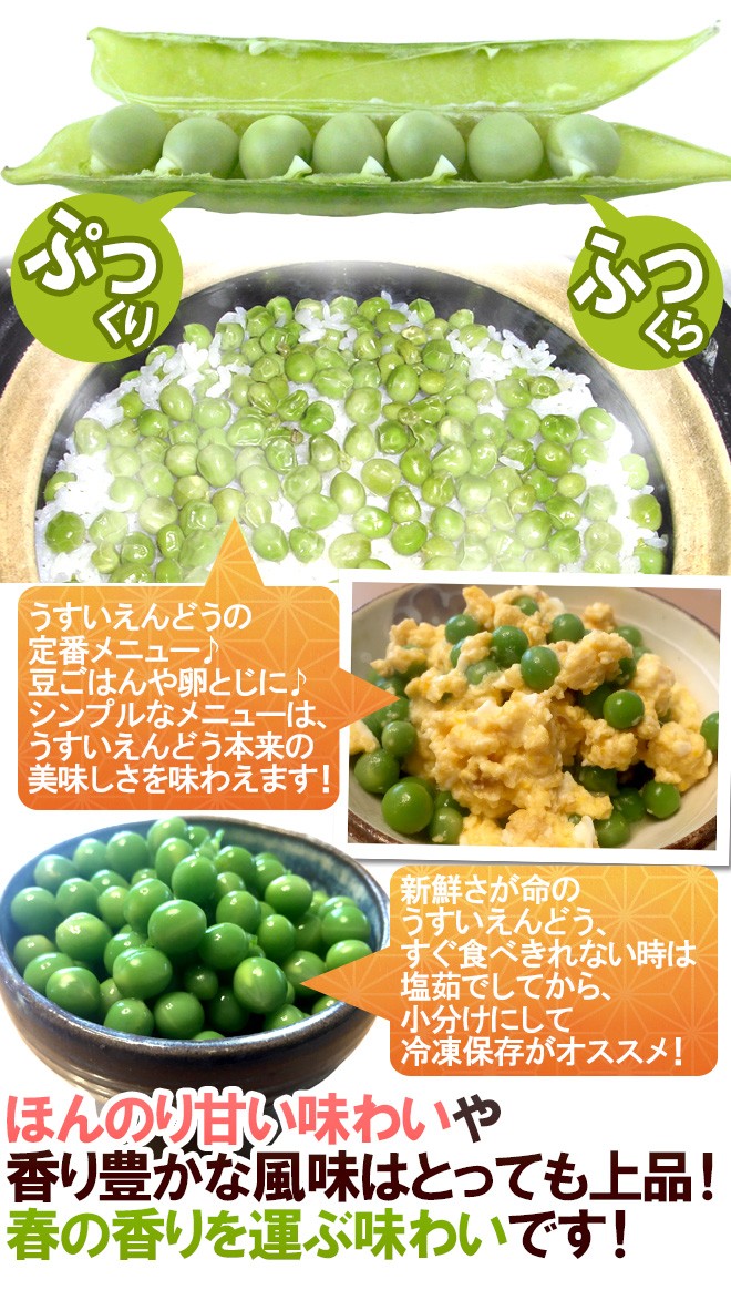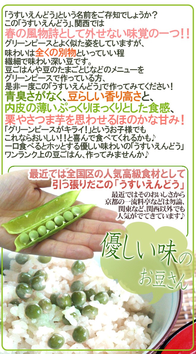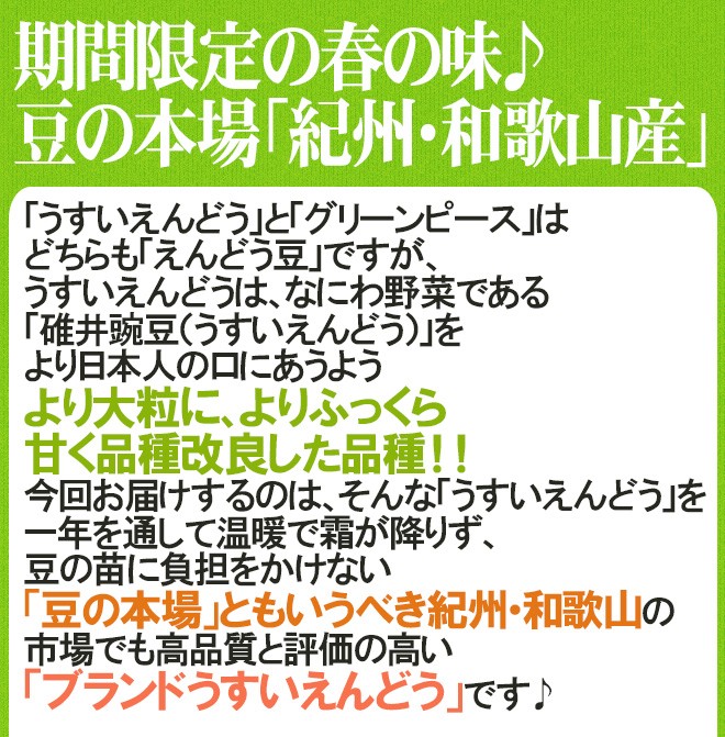 【送料無料】和歌山特産品【碓井エンドウ】!「実えんどう」の一種であるウスイエンドウは、見た目はグリーンピースと似ていますが、味わいは別物!青臭さがなく、ホックホクでほのかな甘味のある上品な味わいが自慢です♪豆ごはんや卵とじなどにも!