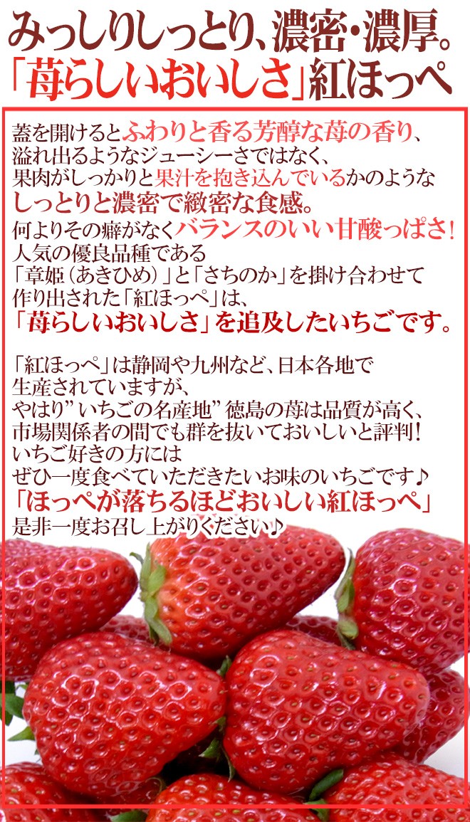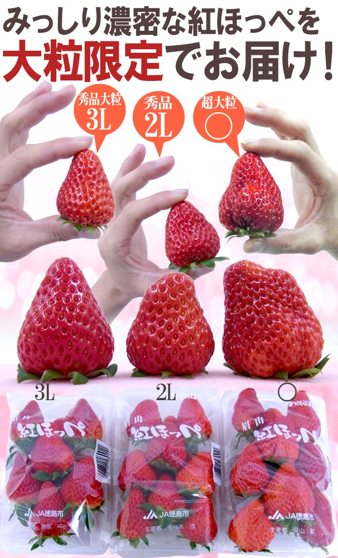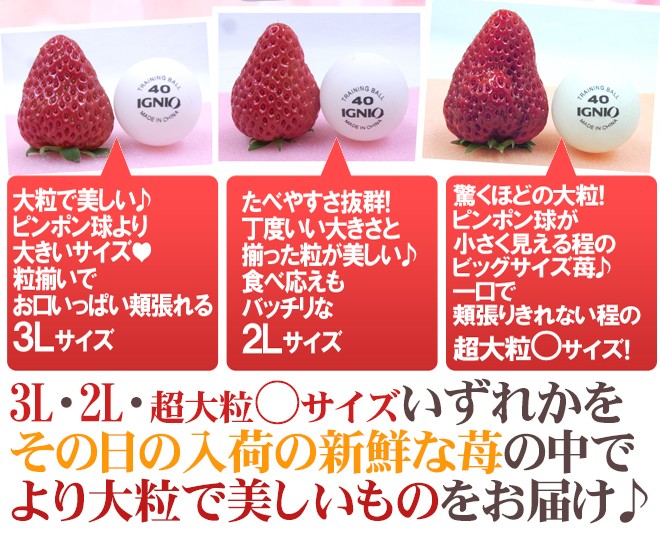 みっしり濃密な紅ほっぺを3L・2L・超大粒○サイズいずれかをその日の入荷の新鮮な苺の中でより大粒で美しいものをお届け♪