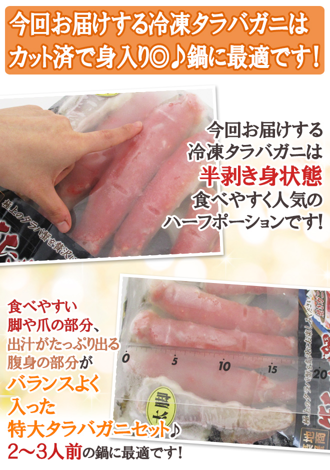 【送料無料】冬といったらやっぱりカニ!!カニ鍋や焼き蟹などにピッタリのたらば蟹を、食べやすく旨みを逃がさないハーフポーション(半むき身)にしました♪プリプリでコク深い!
