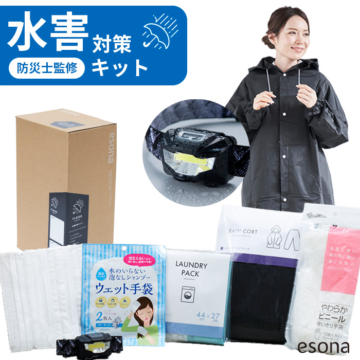 水害対策 キット esona 防災士監修| 防災セット 水害 大雨 豪雨 対策 防災グッズ 防災グッズセット 防災 災害グッズ 防災用品 家族 乾電池式 ヘッドライト LEDライト レインコート 洗濯パック 川 海 安全 中身 だけ リュックなし エソナ
