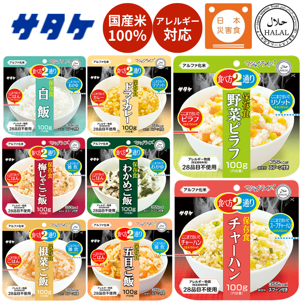 | 詳細 | サタケ マジックライス(白飯): ・国産うるち米使用 ・スプーン付き ・1袋あたり できあがり約260g ・保存期限 5年 ・原材料:うるち米(国産) ・調理方法:熱湯を注いで15分・水なら60分 ・内容量(1食):100g(出来上がり ごはん:260g/おかゆ:390g) サタケ マジックライス(わかめご飯): ・国産うるち米使用 ・スプーン付き ・1袋あたり できあがり約260g ・保存期限 5年 ・原材料:うるち米(国産)、調味顆粒(食塩、酵母エキス)、わかめ/調味料(アミノ酸等)、酸味料 ・調理方法:熱湯を注いで15分・水なら60分 ・内容量(1食):100g(出来上がり ごはん:260g/雑炊:390g) サタケ マジックライス(根菜ご飯): ・国産うるち米使用 ・スプーン付き ・1袋あたり できあがり約260g ・保存期限 5年 ・原材料:うるち米(国産)、調味顆粒(砂糖、食塩、しいたけエキス、しいたけ粉末、酵母エキス、かつお節粉末、こんぶ粉末、コーンスターチ)、しいたけ、味付けにんじん、ごぼう、味付けれんこん、/調味料(アミノ酸)、着色料(カラメル)、pH調整剤 ・調理方法:熱湯を注いで15分・水なら60分 ・内容量(1食):100g(出来上がり ごはん:260g/雑炊:390g) サタケ マジックライス(梅じゃこご飯): ・国産うるち米使用 ・スプーン付き ・1袋あたり できあがり約260g ・保存期限 5年 ・原材料:うるち米(国産)、味付け梅、調味顆粒(食塩、かつお節粉末、粉糖、こんぶ粉末、かつおエキスパウダー、たん白加水分解物、こんぶエキスパウダー)、味付けちりめんじゃこ、ねぎ/調味料(アミノ酸等)、酸味料、pH調整剤、着色料(野菜色素、カラメル色素)、炭酸カルシウム、水酸化カルシウム、ミョウバン、酸化防止剤(ビタミンE) ・調理方法:熱湯を注いで15分・水なら60分 ・内容量(1食):100g(出来上がり ごはん:260g/雑炊:390g) サタケ マジックライス(チャーハン): ・国産うるち米使用 ・スプーン付き ・1袋あたり できあがり約260g ・保存期限 5年 ・原材料:うるち米(国産)、調味顆粒(香味調味料、食塩、粉糖、とうもろこしでん粉、たん白加水分解物、フライドガーリックパウダー、香辛料)、味付けキャベツ、ねぎ/調味料(アミノ酸等)、着色料(カラメル色素)、香料、二酸化ケイ素、甘味料(カンゾウ、ステビア)、香辛料 ・調理方法:熱湯を注いで15分・水なら60分 ・内容量(1食):100g(出来上がり チャーハン:250g/スープチャーハン:390g) サタケ マジックライス(ドライカレー): ・国産うるち米使用 ・スプーン付き ・1袋あたり できあがり約260g ・保存期限 5年 ・原材料:うるち米(国産)、調味顆粒(調味香辛料、香味調味料、砂糖、ブイヨン、調味パウダー、カレー粉)、味付けとうもろこし、味付けにんじん、味付けたまねぎ/調味料(アミノ酸等)、香辛料抽出物、甘味料(カンゾウ)、香料、微粒二酸化ケイ素、酸化防止剤(ビタミンE) ・調理方法:熱湯を注いで15分・水なら60分 ・内容量(1食):100g(出来上がり ごはん:240g/リゾット:390g) サタケ マジックライス(野菜ピラフ): ・国産うるち米使用 ・スプーン付き ・1袋あたり できあがり約260g ・保存期限 5年 ・原材料:うるち米(国産)、調味顆粒(香味調味料、食塩、粉糖、コーンスターチ、たん白加水分解物)、味付けキャベツ、味付けとうもろこし、味付けにんじん、/調味料(アミノ酸等)、香辛料抽出物、香料、微粒二酸化ケイ素、甘味料(カンゾウ、ステビア)、着色料(カラメル) ・調理方法:熱湯を注いで15分・水なら60分 ・内容量(1食):100g(出来上がり ピラフ:250g/リゾット:390g) サタケ マジックライス(五目ご飯): ・国産うるち米使用 ・スプーン付き ・1袋あたり できあがり約260g ・保存期限 5年 ・原材料:うるち米(国産)、調味顆粒(食塩、粉糖、かつお節粉末、こんぶ粉末、しいたけエキス、しいたけ粉末、酵母エキス)、味付けにんじん、ごぼう、しいたけ、味付けれんこん、味付けたけのこ/調味料(アミノ酸)、着色料(カラメル色素)、香料、pH調整剤 ・調理方法:熱湯を注いで15分・水なら60分 ・内容量(1食):100g(出来上がり ごはん:260g/雑炊:390g) |