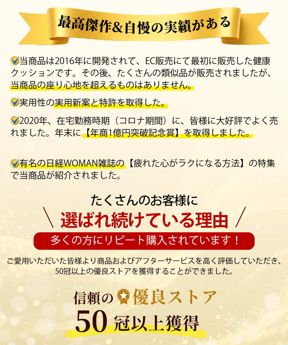 【姿勢矯正・美しいシルエットへ】オリジナルのクッション形状で、お尻の自然なカーブを守ります。座るだけで背筋が自然に伸びして、重心の位置を正しく保ち、腰痛改善が期待可能。